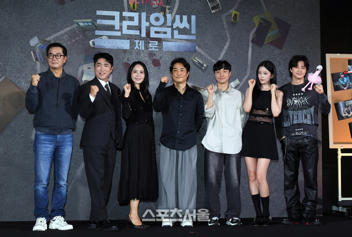 16일 서울 구로구 라마다서울신도림호텔에서 진행된 넷플릭스 예능 ‘크라임씬 제로’ 제작발표회에서 출연자들이 취재진을 향해 포즈를 취하고 있다. 왼쪽부터 영화 감독 장진, 개그맨 장동민, 방송인 박지윤, 윤현준 감독, 황슬우 감독, 아이브 안유진, 배우 김지훈.