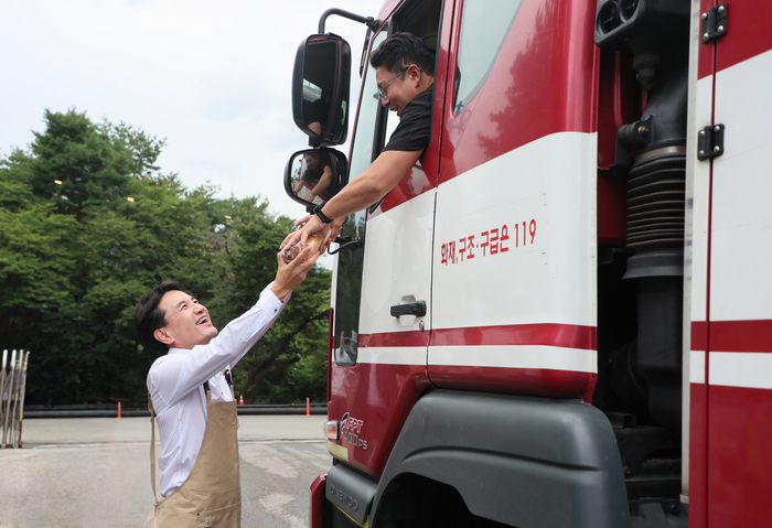 [스포츠서울ㅣ춘천=김기원기자]김진태 강원특별자치도지사는 9월 16일(화) 오후 강릉 홍제정수장을 방문해 가뭄 극복을 위해 힘쓰고 있는 소방관과 군 장병 등 현장 종사자들에게 간식을 전달하며 격려했다.
