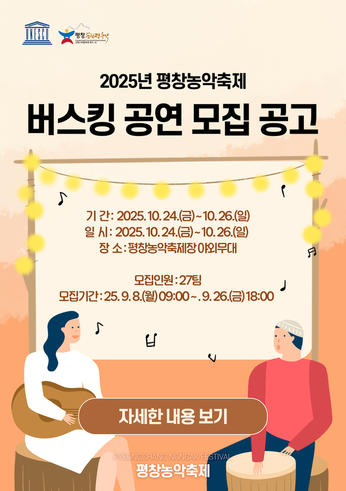모집 기간은 9월 8일(월)부터 9월 26일(금)까지 19일간이며, 총 27팀을 선정한다. 심사 결과는 10월 1일(수) 개별 연락 및 평창농악축제위원회 홈페이지를 통해 발표된다.