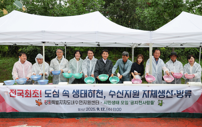 [스포츠서울ㅣ춘천=김기원기자]강원특별자치도(도지사 김진태)는 9월 17일(수) 오전 11시, 약사천과 공지천이 합류하는 월드비전 춘천 종합사회복지관 앞에서 시민생태모임 ‘공지천사람들’과 협약을 체결하고 수산자원 방류행사를 진행했다.
