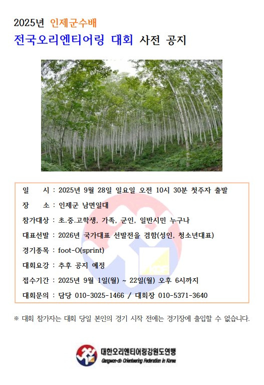 [스포츠서울ㅣ김기원기자]인제군은 대한오리엔티어링 강원특별자치도연맹이 주최하고 인제군이 후원하는 ‘2025 인제군수배 전국 오리엔티어링대회’가 오는 28일 인제군 남면 일원에서 개최된다고 말했다.