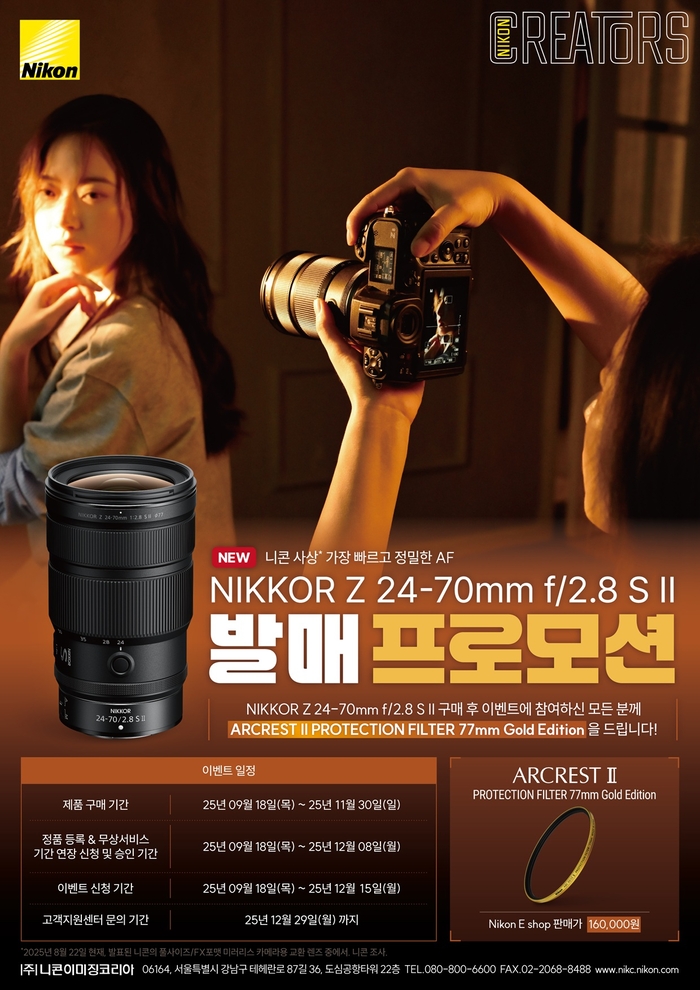 니콘이미징코리아 이주은 마케팅부장은 “신제품 NIKKOR Z 24-70mm f/2.8 S II는 최고 수준의 방진, 방적은 물론 전작과 차별화된 다양한 신기술이 적용된 것이 특징”이라며 “렌즈 구매를 그동안 고민하셨다면 이번 이벤트를 통해 니콘의 고성능 렌즈 보호 필터까지 함께 챙겨 보시기 바란다”고 전했다.