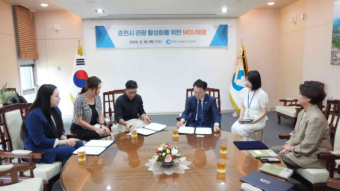 육동한 춘천시장은 18일 시청 접견실에서 아티쉬 타파 쿠팡 전무와 ‘춘천테마관’ 개설을 위한 업무협약(MOU)을 체결했다. 협약에는 쿠팡앱과 웹사이트에 춘천 전용 관광 기획전인 ‘춘천 테마관’을 개설하고 주요 관광지와 숙박 등 다양한 콘텐츠를 홍보하는 내용이 담겼다.