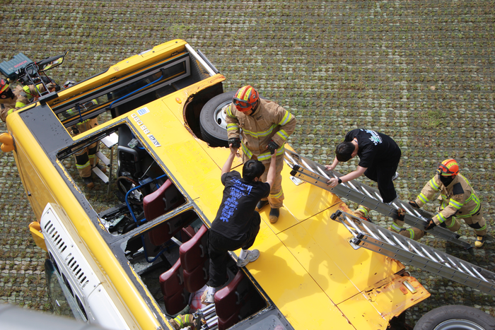 소방서는 교량 밑 버스 추락으로 인한 대형 화재 및 다수 사상자가 발생한 상황을 부여했다.