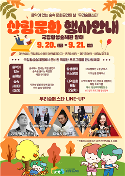 이번 행사는 아름다운 숲에서 국민 누구나 누릴 수 있는 문화축제로, 숲속에서 펼쳐지는 공연과 체험을 통해 산림문화의 사회적 가치 확산과 소외계층의 산림문화 향유 기회 제공을 목적으로 마련됐다.