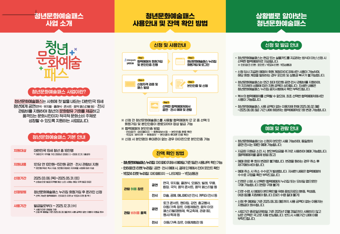 신청은 청년문화예술패스 공식 누리집을 통해 온라인으로 할 수 있다. 발급받은 패스는 협력 예매처(인터파크 또는 YES24)에서 공연이나 전시를 예매할 때 사용할 수 있으며, 사용 기한은 올해 연말까지다.
