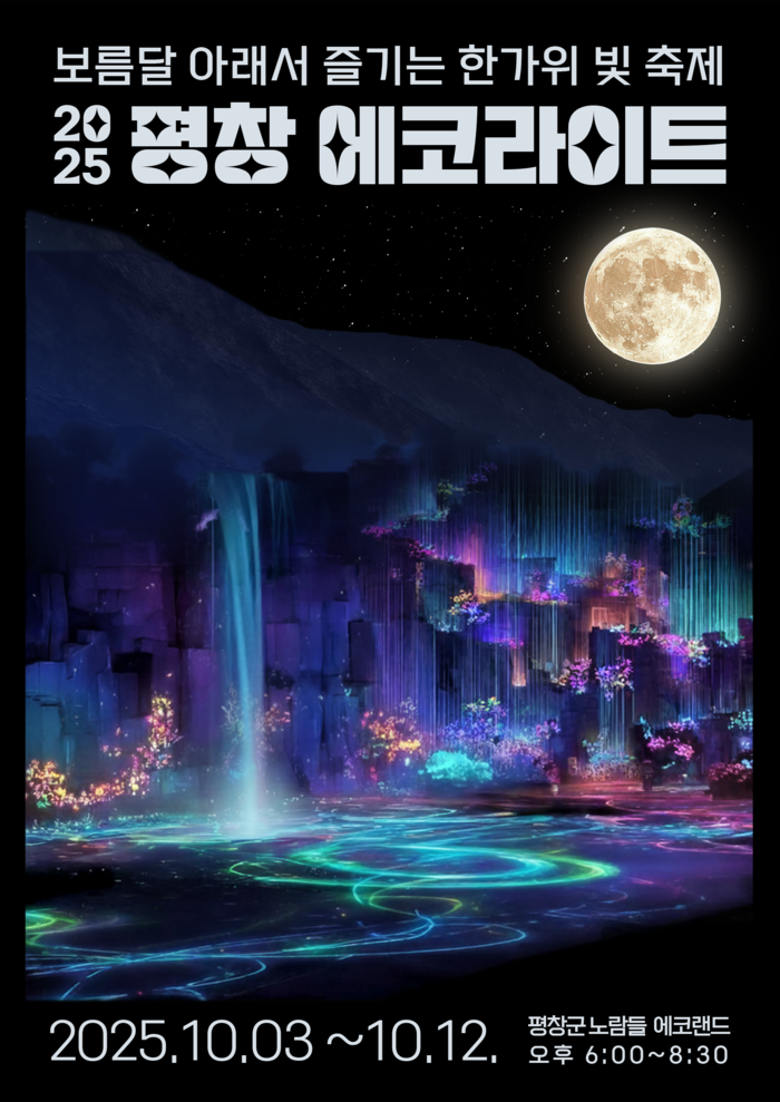 ‘올림픽 도시를 지나, 미래 에코 도시로의 도약, 평창’이라는 슬로건과 함께, ‘보름달 아래서 즐기는 한가위 빛 판타지’를 주제로 열리는 이번 에코라이트는 평창의 청정 자연과 빛의 판타지를 결합해 환상적인 야간 경관을 선사한다.