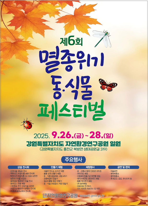 [스포츠서울ㅣ춘천=김기원기자]강원특별자치도 자연환경연구공원은 9월 26일(금)부터 28일(일)까지 3일간 홍천군 북방면 성동리 일원 자연환경연구공원에서 「제6회 멸종위기 동·식물 페스티벌」을 개최한다고 밝혔다.