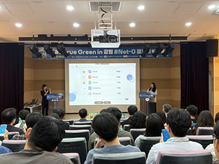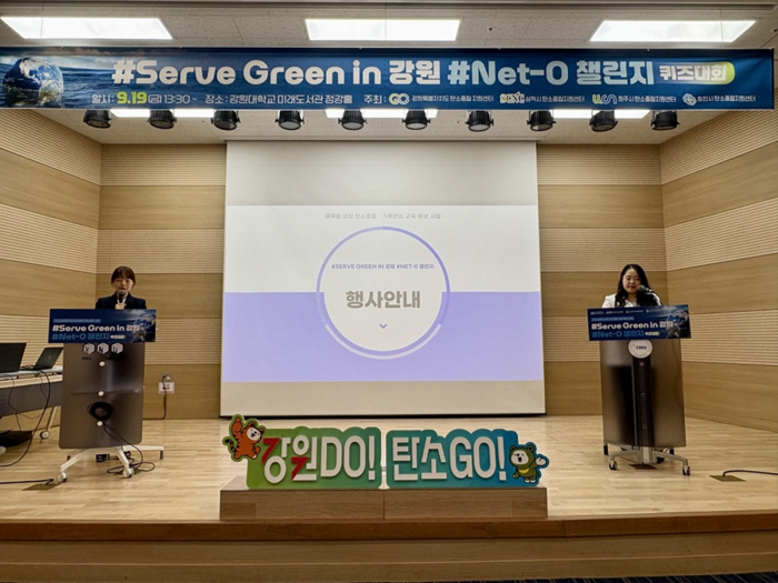 [스포츠서울ㅣ춘천=김기원기자]강원특별자치도·삼척·원주·춘천 탄소중립 지원센터(센터장 김진영·김주영·전용한·임성린)는 19일(금), 강원대 정강홀에서 도내 공무원 100여 명을 대상으로 탄소중립 퀴즈대회 「#Serve Green in 강원 #Net-0 챌린지」를 개최했다고 밝혔다.