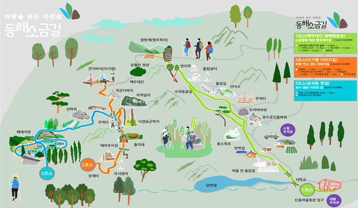 한편, 동해소금길은 북평장터에서 산 소금을 정선 임계장터 등인 영서지역으로 이동시킬 때 사용된 백두대간의 고갯길로, “소금땀에 젖은 명주목이길”인 1코스(백두대간 생태탐방로)와 “바람 안고 걷는 더바지길”인 2코스(이기령더바지숲길), “호수 품은 치유의 길”인 3코스(금곡동 옛길)으로 조성되어 있다.