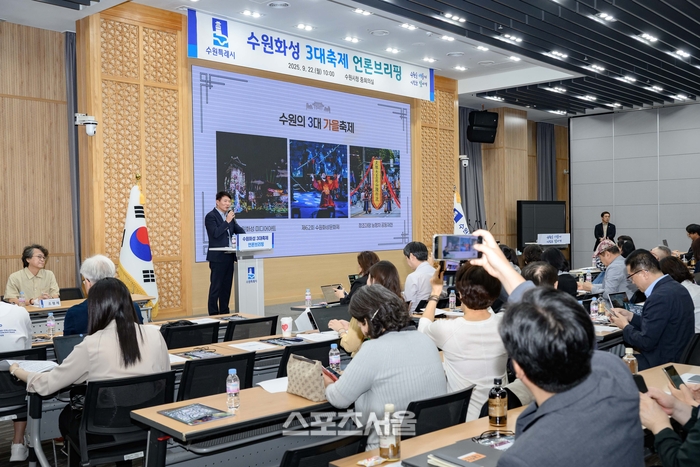 곽도용 수원시 문화청년체육국장은 22일 시청 중회의실에서 ‘세계유산 수원화성 3대 가을축제 언론브리핑’을 열고, “3대 가을축제가 글로벌축제로 자리매김하도록 최선을 다해 준비하겠다”고 말했다.