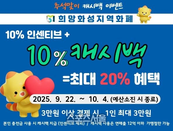 〔스포츠서울│화성=좌승훈기자〕경기 화성시는 추석 명절을 맞아 22일부터 10월 4일까지 ‘희망화성지역화폐 특별 캐시백 이벤트’를 운영한다.