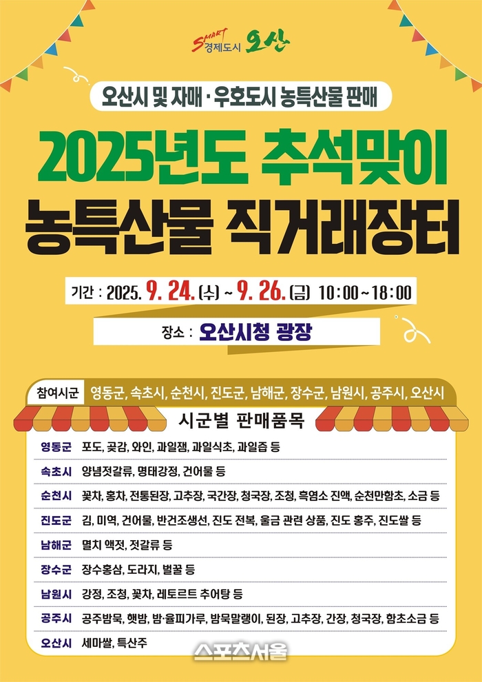 〔스포츠서울│오산=좌승훈기자〕경기 오산시는 민족 최대 명절 추석을 맞아 오는 24일부터 26일까지 3일간 시청 광장에서 ‘추석맞이 자매도시 농특산물 직거래장터’를 연다.