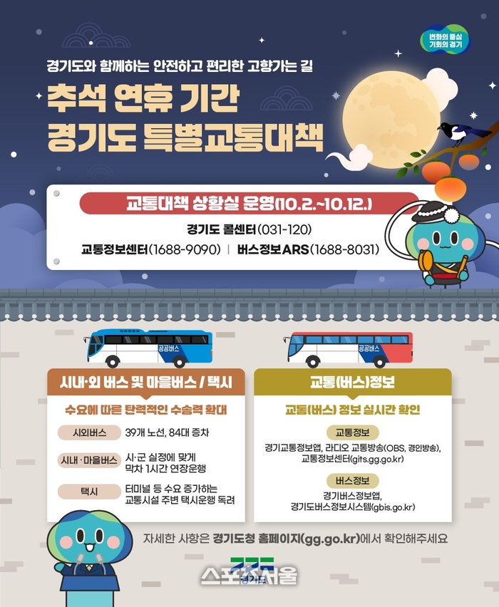〔스포츠서울│수원=좌승훈기자〕경기도는 오는 10월 2일부터 12일까지 ‘추석 연휴 특별교통대책기간’으로 정하고 귀성길 대책을 추진한다.