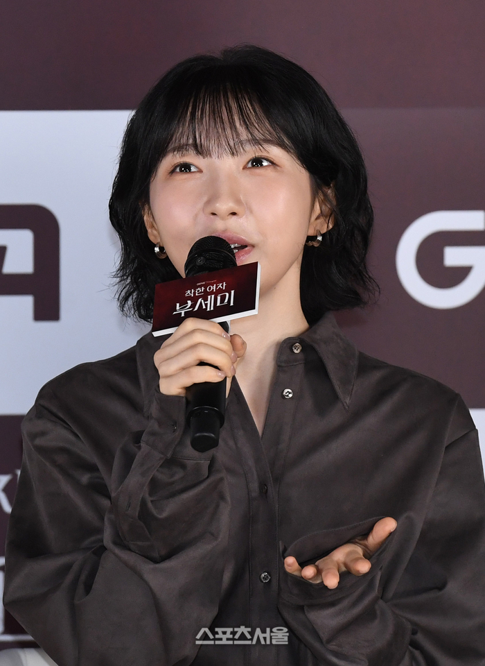 배우 주현영이 22일 서울 영등포구 영등포 CGV에서 열린 지니TV 오리지널 ‘착한 여자 부세미’ 제작발표회에서 취재진의 질문에 답을 하고 있다.