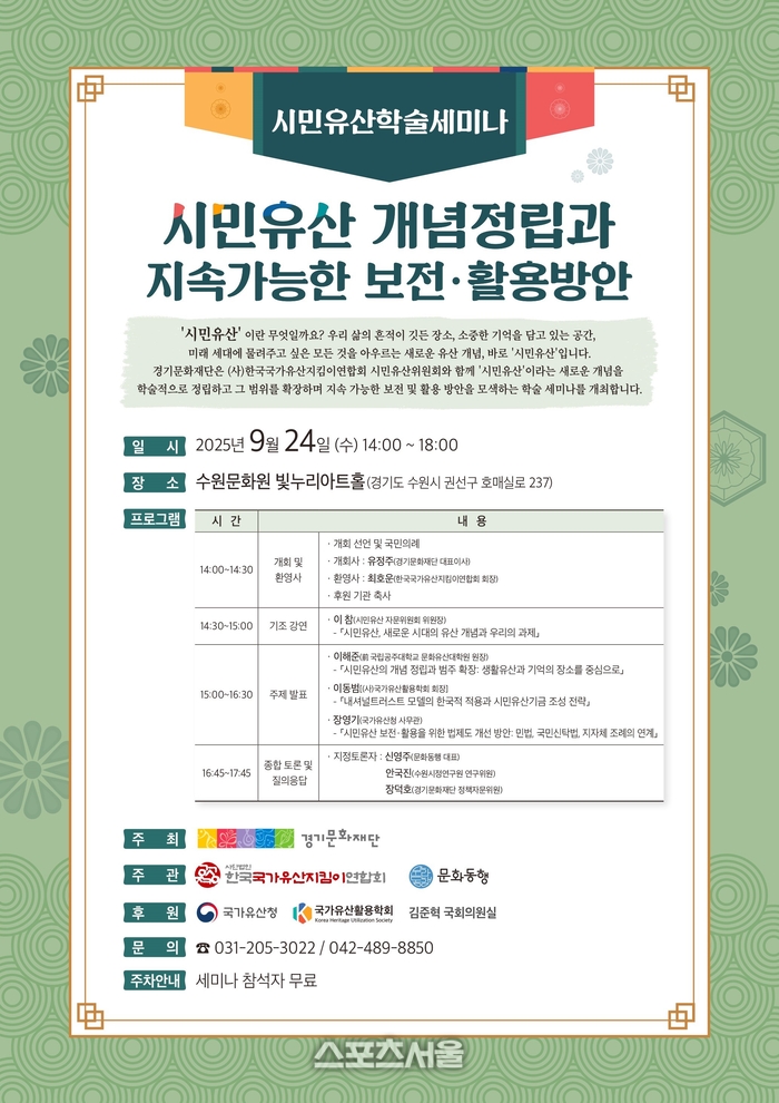〔스포츠서울│수원=좌승훈기자〕경기문화재단은 오는 24일 오후 2시 수원문화원 빛누리아트홀에서 ‘시민유산 개념정립과 지속가능한 보전·활용방안’ 학술 세미나를 개최한다.