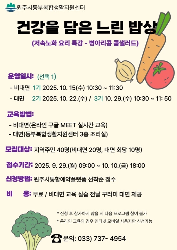 [스포츠서울ㅣ원주=김기원기자]원주시동부복합생활지원센터는 오는 29일부터 저속노화 요리 특강 ‘건강을 담은 느린 밥상’ 프로그램 참여자를 모집한다.