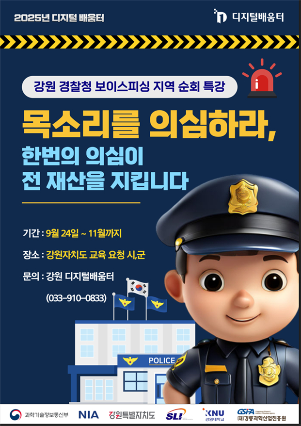 윤우영 강원특별자치도 행정국장은 “보이스피싱은 단순 범죄가 아니라 고령층의 삶을 위협하는 심각한 사회문제”라며 “추석 전후 취약 시기를 노리는 범죄에 맞서 현직 경찰관의 경험과 대응 요령을 생생히 전달하고, 디지털배움터를 통한 지속 학습 체계로 도민 스스로를 지킬 수 있는 힘을 키우겠다”고 밝혔다.