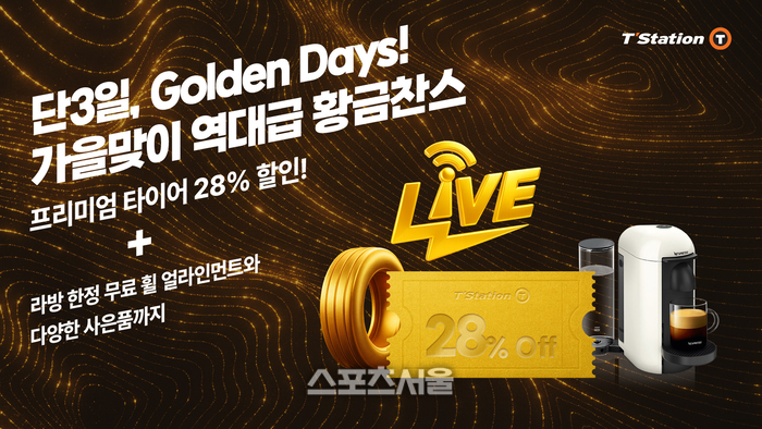 행사 기간 동안, ‘골든 찬스(Golden Chance)’ 혜택을 통해 티스테이션닷컴 고객 모두에게 행사 제품 28% 할인 쿠폰이 제공된다. ‘올바른 타이어 캠페인’ 참여 고객에게는 행사 제품 4개 구매 시 중복 적용 가능한 1만 원 할인 쿠폰, 신한카드 사전 신청 고객에 한하여 지정 카드로 10만 원 이상 결제 시 10만 원의 캐시백 혜택도 누릴 수 있다.