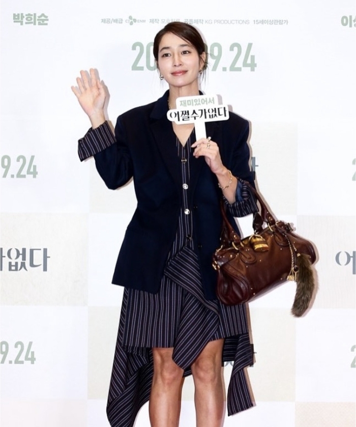 이민정은 23일 자신의 인스타그램에 “다리만 탄 건... #어쩔수가 없다”라는 글과 함께 사진 네 장을 게재했다. 공개된 사진 속 이민정은 영화 ‘어쩔 수가 없다’ 시사회 현장에서 세련된 스타일링으로 눈길을 끌었다. 특히 블랙 재킷과 언밸런스한 스트라이프 원피스로 세련되면서도 시크한 분위기를 자아내며 특유의 우아한 미모를 뽐냈다.