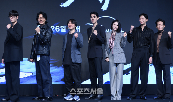 김동원, 최귀화, 추창민 감독, 박서함, 신예은, 로운, 박지환(왼쪽부터)이 23일 서울 논현동 엘리에나 호텔에서 진행된 디즈니+ 오리지널 시리즈 ‘탁류’ 제작발표회에서 포즈를 취하고 있다.