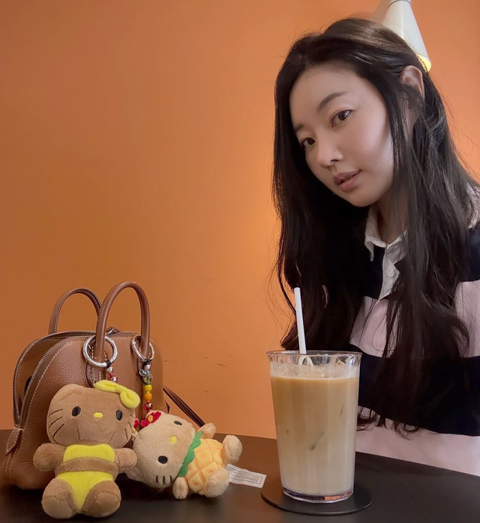 사진 속 김사랑은 카페 테이블에 앉아 음료를 즐기거나, 길거리 야외 테이블에 앉아 휴대폰을 보고 있는 모습을 통해 여유로운 일상을 보내고 있다.