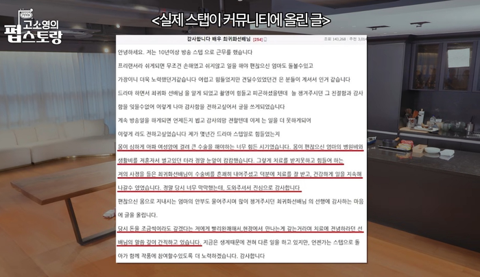 이 미담은 지난 22일 방송된 유튜브 웹예능 ‘고소영의 펍스토랑’에서 최귀화가 직접 언급하면서 세상에 알려졌다. 방송에서 그는 “함께 일하던 한 스태프가 여성암 진단을 받고 수술비가 부담돼 힘들어하던 상황이 있었다”며 당시를 회상했다. 그는 즉시 주저하지 않고 치료비를 마련해 건넸다고 담담하게 밝혔다.