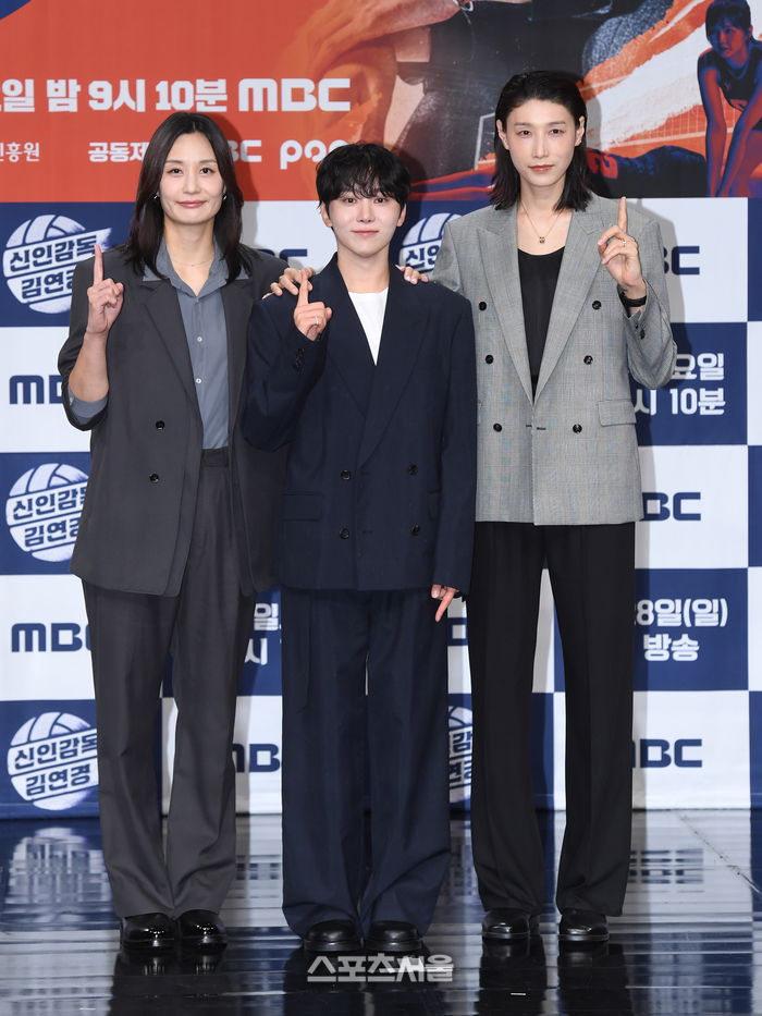 표승주(왼쪽)과 승관(가운데), 김연경이 24일 서울 마포구 MBC 신사옥 골든마우스홀에서 열린 MBC 새 예능 ‘신인감독 김연경’ 제작발표회에서 취재진을 향해 포즈를 취하고 있다.
