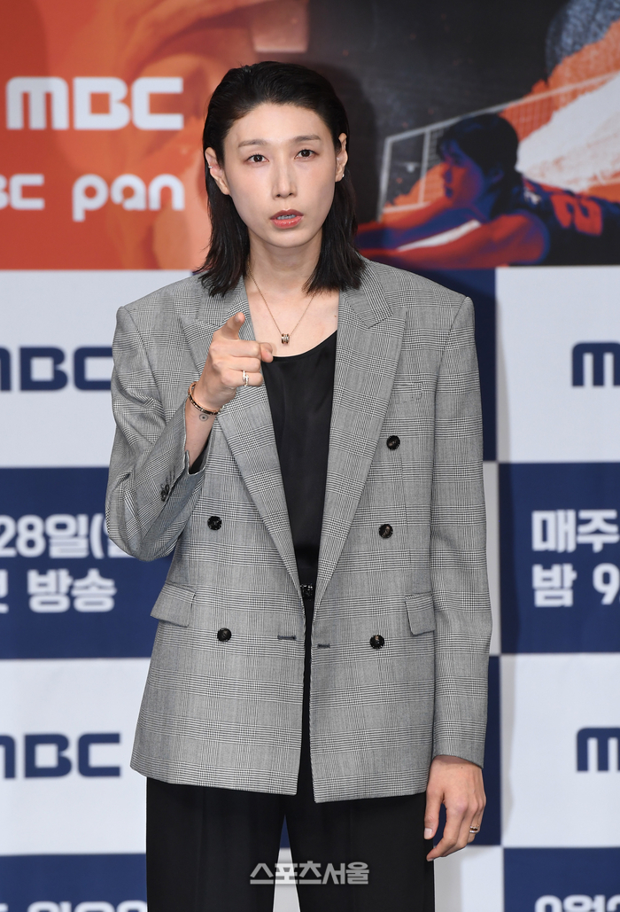 배구 레전드 김연경이 24일 서울 마포구 MBC 신사옥 골든마우스홀에서 열린 MBC 새 예능 ‘신인감독 김연경’ 제작발표회에서 취재진을 향해 포즈를 취하고 있다.