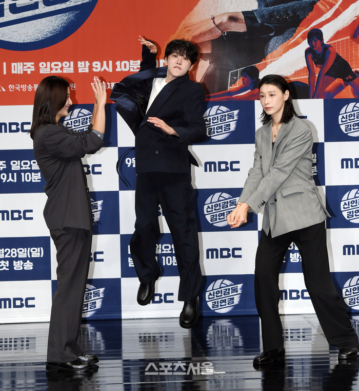 표승주(왼쪽)와 승관(가운데), 김연경이 24일 서울 마포구 MBC 신사옥 골든마우스홀에서 열린 MBC 새 예능 ‘신인감독 김연경’ 제작발표회에서 취재진을 향해 포즈를 취하고 있다.