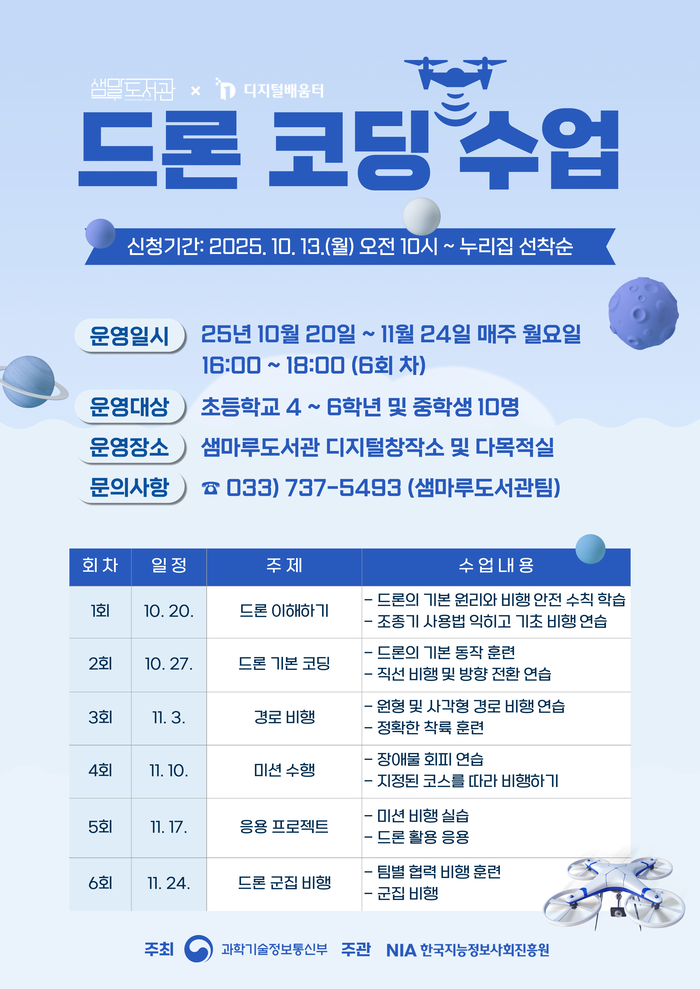 [스포츠서울ㅣ원주=김기원기자]원주시 샘마루도서관은 과학기술정보통신부가 주최하고 한국지능 정보사회진흥원에서 주관하는 ‘디지털 역량 강화 교육: 드론 코딩 수업’을 10월 20일부터 11월 24일까지 운영한다.