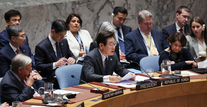 이 대통령은 24일(현지시간) 미국 뉴욕 유엔본부에서 열린 안보리 공개 토의 의장석에 앉아 회의를 이끌었다.