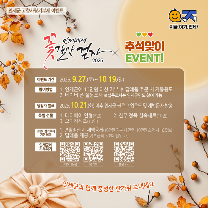 [스포츠서울ㅣ김기원기자]인제군이 ‘2025 인제 가을꽃축제’와 추석명절을 맞아 ‘고향사랑기부제 특별 이벤트’를 오는 27일부터 다음 달 19일까지 진행한다.