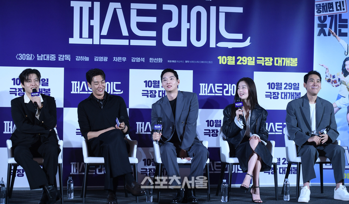 강하늘, 김영광, 강영석, 한선화, 남대중 감독(왼쪽부터)이 25일 서울 CGV 용산아이파크몰에서 진행된 영화 ‘퍼스트 라이드’ 제작보고회에서 MC의 질문에 답하고 있다.