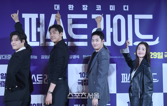 강하늘, 김영광, 강영석, 한선화(왼쪽부터)가 25일 서울 CGV 용산아이파크몰에서 진행된 영화 ‘퍼스트 라이드’ 제작보고회에서 포토타임을 갖고 있다.