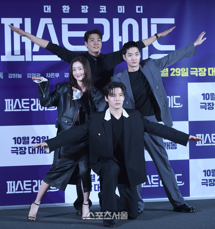 강하늘, 김영광, 강영석, 한선화가 25일 서울 CGV 용산아이파크몰에서 진행된 영화 ‘퍼스트 라이드’ 제작보고회에서 포토타임을 갖고 있다.