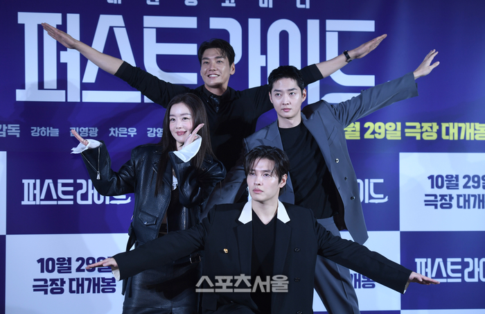 강하늘, 김영광, 강영석, 한선화가 25일 서울 CGV 용산아이파크몰에서 진행된 영화 ‘퍼스트 라이드’ 제작보고회에서 포토타임을 갖고 있다.