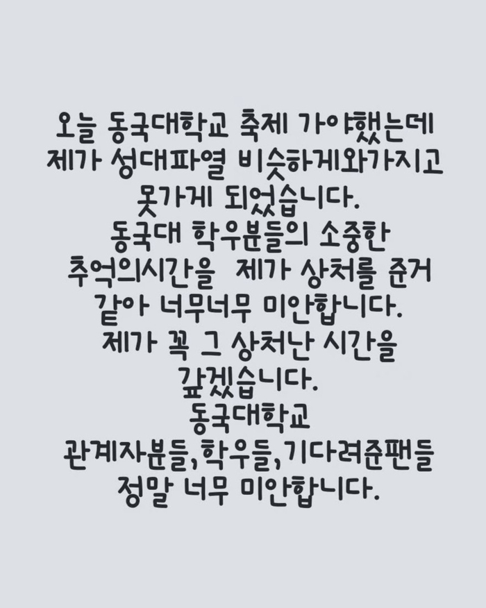 이어 이홍기는 “동국대 학우분들의 소중한 추억의 시간을 제가 상처를 준거 같아 너무 너무 미안하다”며 사과했다. 또한 이홍기는 “제가 꼭 그 상처난 시간을 갚겠다”며 “동국대학교 관계자분들, 학우들, 기다려준팬들 정말 너무 미안하다”며 다시 한 번 사과의 뜻을 전했다.