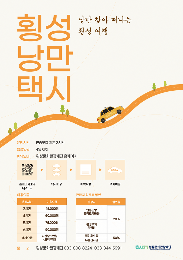 [스포츠서울ㅣ김기원기자]횡성군과 횡성문화관광재단은 ‘2025 강원 방문의 해’를 기념해 낭만택시 특별 할인 행사를 오는 11월 30일까지 진행한다고 밝혔다.
