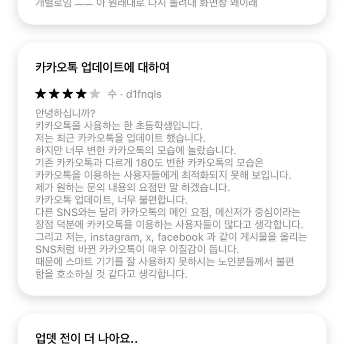 반면, 초등학생으로 보이는 한 이용자는 “안녕하세요? 카카오톡을 사용하는 한 초등학생입니다”라는 말로 리뷰를 시작해 눈길을 끌었다. 그는 “너무 변한 카카오톡의 모습에 놀랐다”며 장문의 글로 문제점을 조목조목 지적했다. 이어 “노인분들께서 불편함을 호소하실 것 같다”고 덧붙이며 어른스럽고 예의 바른 문장을 남겼다.
