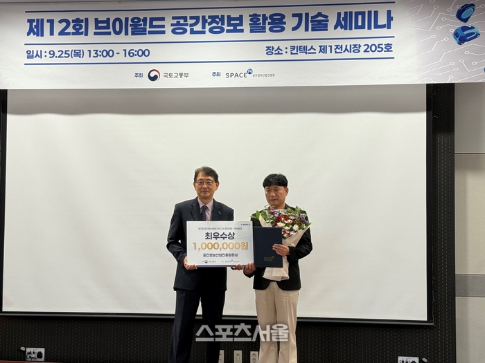 대회 시상식은 25일 일산 킨텍스에 열린 ‘2025 공간정보기술박람회(K-Geo Festa)’에서 진행됐으며, 심사는 공간정보를 활용한 기관 업무 개선 우수사례 등에 대해 전달성, 효과성, 지속성 등 6개 항목 평가로 진행됐다.