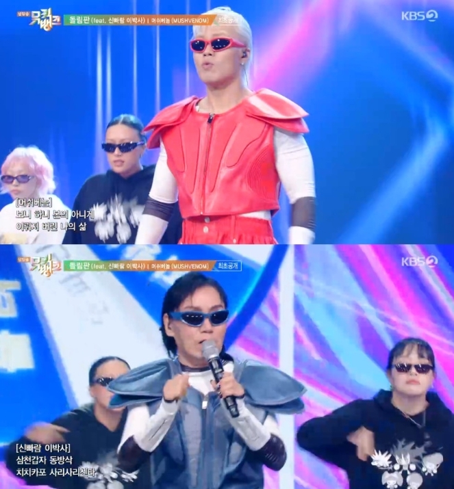 머쉬베놈은 지난 26일 방송된 KBS2 ‘뮤직뱅크’에 출연, 신빠람 이박사와 함께 첫 정규앨범 ‘얼’의 타이틀곡 ‘돌림판(feat. 신빠람 이박사)’ 무대를 최초 공개했다.