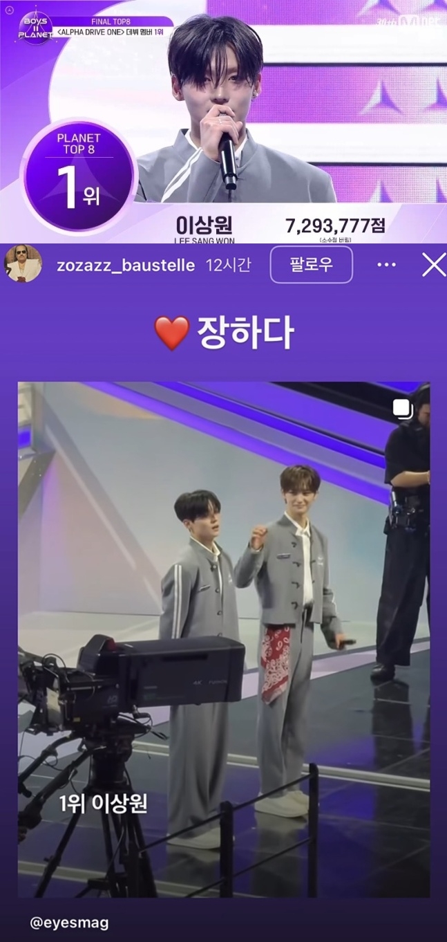 조째즈는 지난 26일 개인 인스타그램 스토리를 통해 Mnet ‘보이즈 2 플래닛’ 최종 결과 발표 현장을 직접 촬영한 것으로 추정되는 사진 한 장을 공개했다. 사진 속에는 마지막까지 순위 경쟁했던 이상원과 조우안신의 모습이 담겨있다. 조째즈는 ‘1위 이상원’과 ‘♥장하다’라는 글과 함께 그를 축하했다.