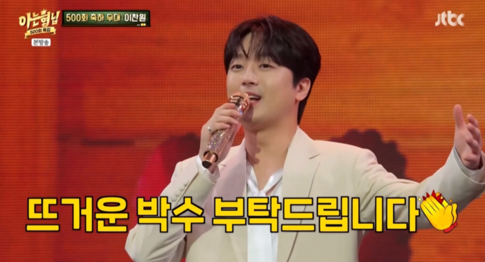 가수 이찬원은 27일 방송된 ‘아는 형님’ 500회 특집에 게스트로 출연해 자신의 히트곡 ‘진또배기’ 무대를 선보이며 축제 분위기를 절정으로 끌어올렸다.