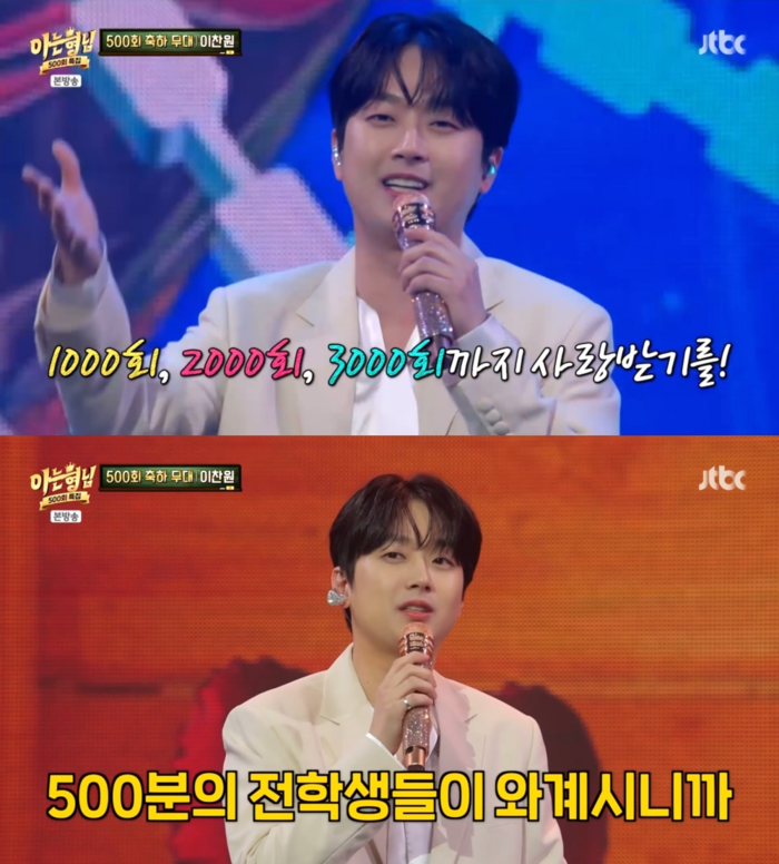 이날 이찬원은 뮤트 톤의 세련된 수트를 입고 무대에 등장하자마자 환호성을 받았다. 그는 “‘아는 형님’ 500회를 진심으로 축하드린다. 1000회, 2000회, 3000회까지 많은 분들의 사랑을 받기를 바란다”라며 따뜻한 인사로 무대를 열었다.