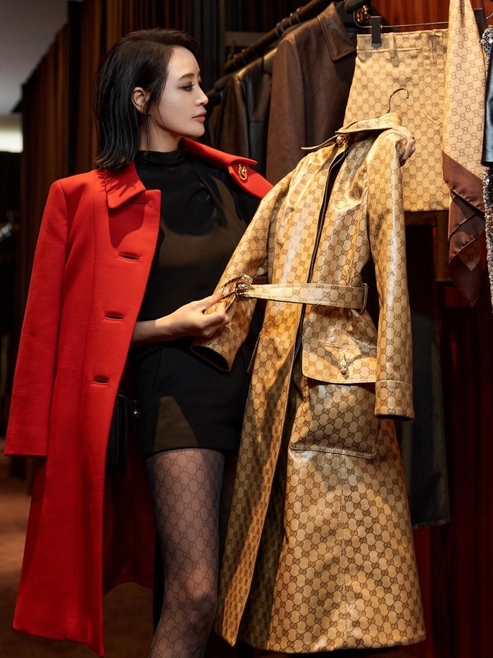 블랙 터틀넥 상의와 쇼츠를 매치해 세련된 올블랙 룩을 완성한 그는, 코트의 선명한 레드 컬러를 포인트로 활용해 독보적인 존재감을 발산했다. 특히, 하의에 드러난 명품 브랜드의 시그니처 로고 패턴 스타킹과 블랙 핸드백을 매치해 트렌디하면서도 고혹적인 분위기를 더했다.