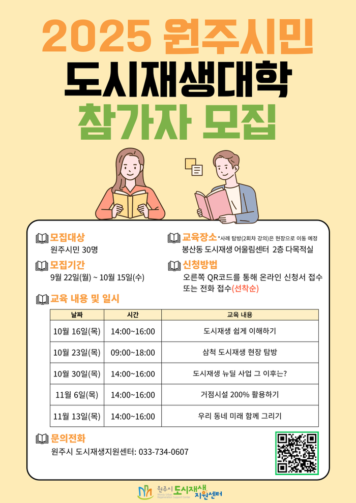 [스포츠서울ㅣ원주=김기원기자]원주시는 다음 달 16일 개강하는 ‘2025 원주시민 도시재생대학’수강생을 모집한다.