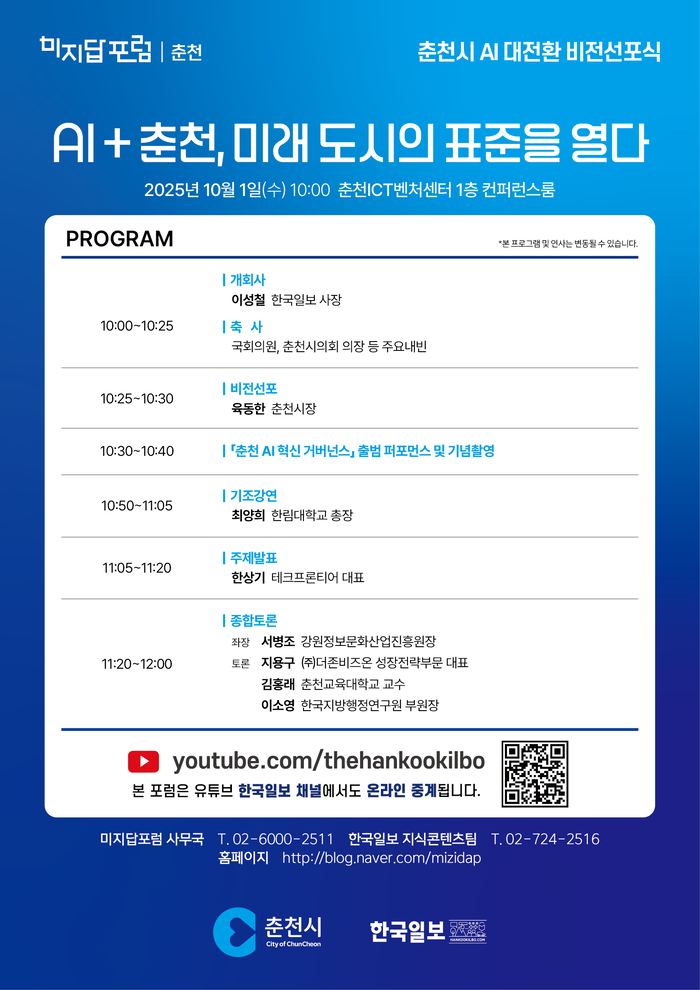 육동한 춘천시장은 “AI는 이미 도시의 미래를 바꾸는 핵심 동력”이라며 “이번 비전 선포식은 시민이 체감하는 AI 정책을 통해 춘천이 전국 최고의 AI 선도도시로 나아가는 출발점이 될 것”이라고 말했다. 이어 “춘천 AI 혁신 거버넌스와 시민이 함께 만들어갈 번영의 미래를 그려가겠다”고 강조했다.