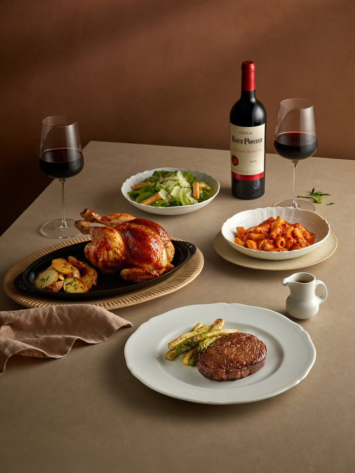 샤또 오 뽕떼 쌩떼밀리옹 그랑 크뤼 레드와인 1병과 함께 시저 샐러드, 매콤한 토마토 소스의 생면 리가토니, 로스트 치킨, 한우 꽃등심 스테이크 등 시그니처 메뉴 4종이 제공된다.