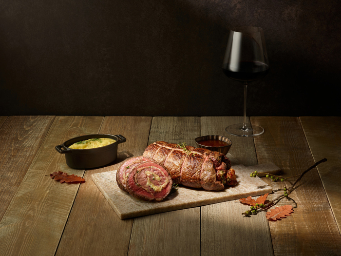 로사 디 파르마는 파르마 햄, 파마산 치즈, 허브를 소고기 안심에 말아 구운 이탈리아 정통 요리로, 셰프가 직접 카빙하는 퍼포먼스도 즐길 수 있다.
